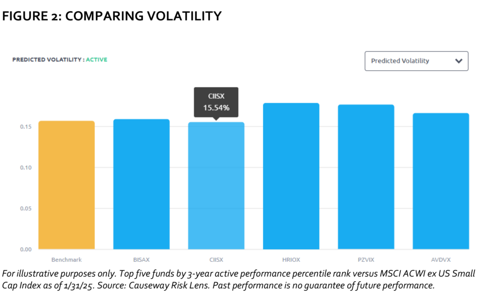 Figure 2 compares the volatility of five top performing funds as of January 31, 2025 that are benchmarked to the ACWI ex US Small Cap Index. Causeway International Small Cap Fund’s predicted volatility is slightly below that of the other 4 funds and the index, based on publicly available holdings at January 31, 2025.