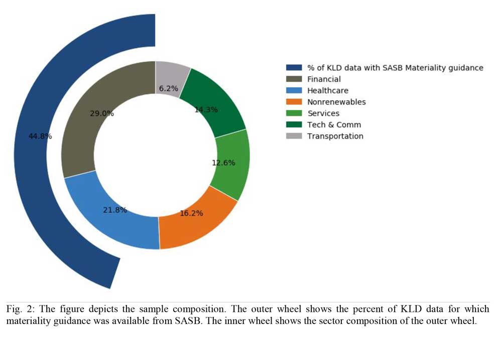 The Khan et al. paper describes the data used by the authors, and this is summarized here. The authors obtained data on material issues by industry from SASB, and firm-level ESG performance scores from KLD. The data in the study was for U.S. firms between 1992 and 2013. As of 2014 when the study was initiated, SASB had issued materiality guidance for six out of ten sectors, covering 45 industries. The final sample included 14,388 firm-years (see their Table 1 for more detail). Fig. 2 below shows the sample composition. The outer wheel shows the percent of available ESG data from KLD for which materiality guidance was available from SASB. The inner wheel shows the sector composition of the outer wheel.