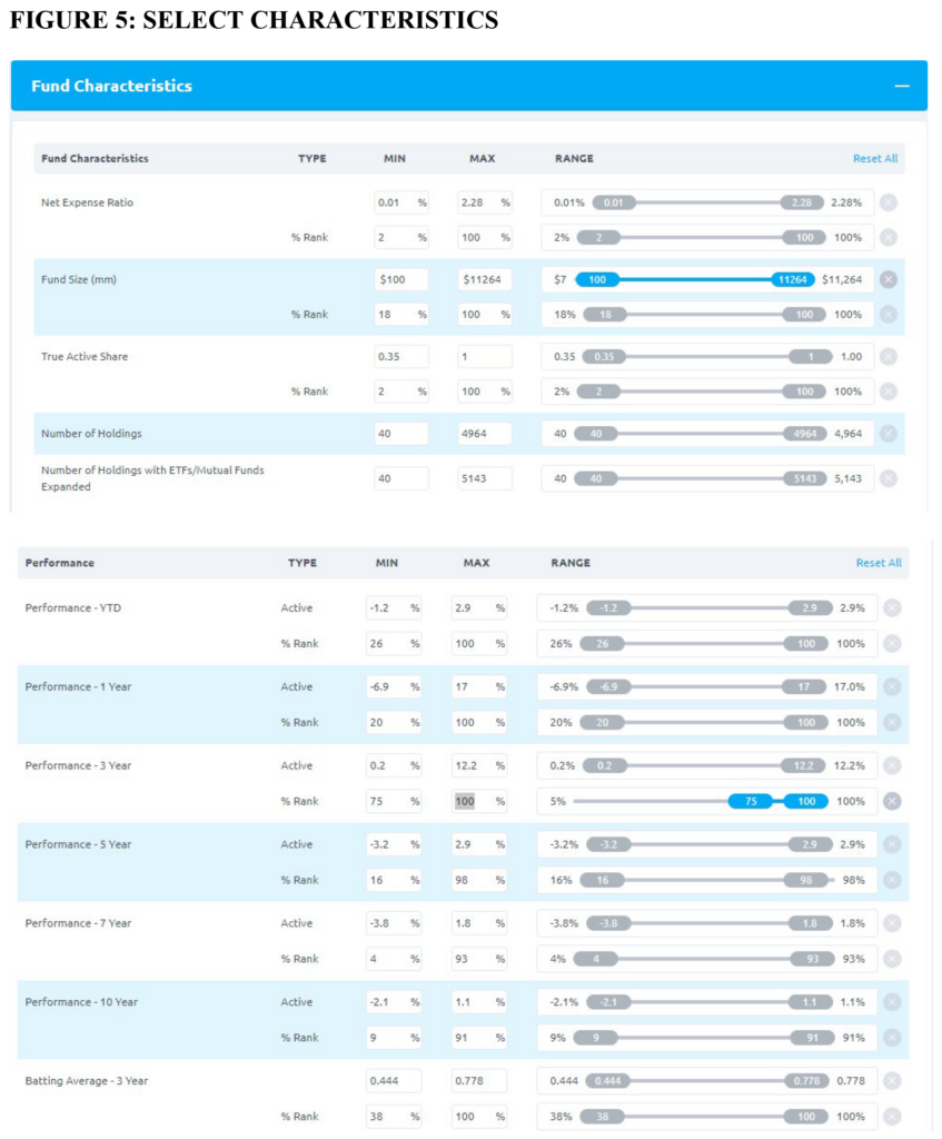 Users can further refine the search as desired, adding screens for batting average, upside or downside capture, active style exposures, predicted risk metrics, and even active ESG scores.