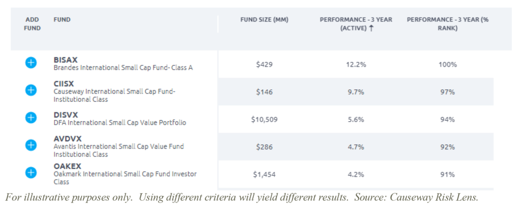 TS: Yes, but when you use Risk Lens, you select your own funds for analysis. You can include Causeway Funds, or leave them out. And we don’t tweak Risk Lens programming to promote Causeway Funds. Risk Lens is a search engine that pulls up funds and ETFs based on the criteria entered by the user. Risk Lens has a very broad universe – it covers approximately 3,400 U.S.-registered equity mutual funds and ETFs, approximately 9,500 share classes, and 37 benchmarks across all major geographies.