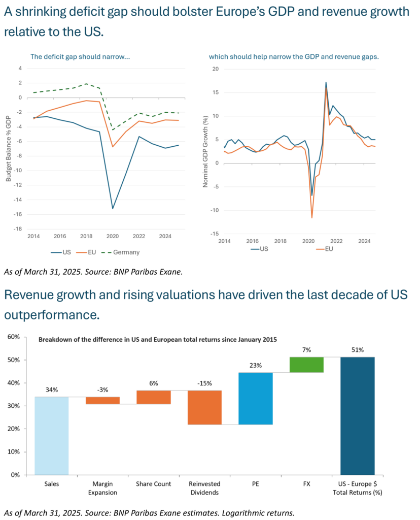 We expect US stocks should relinquish some of the valuation premium gained over the past decade, reinforcing our caution on valuations. Meanwhile, we believe the EU must spend more on defense and infrastructure. Led by Germany, this stimulus should be deployed just as the US withdraws its own.